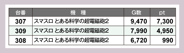 3台設置の『スマスロ とある科学の超電磁砲2』はいずれも高稼働で、7,000ptオーバーなどptの面でも好成績だった。