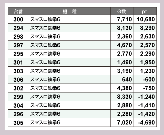 『スマスロ鉄拳6』は13台中7台がプラスpt。1万ptオーバーも飛びだし、そのポテンシャルを存分に発揮している。