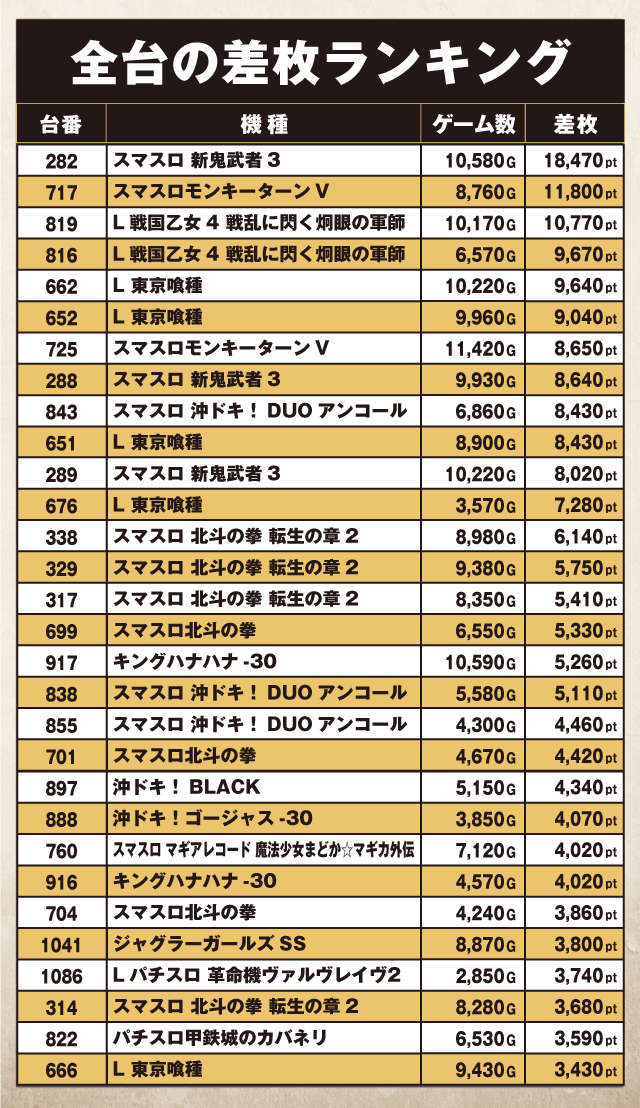 『スマスロ 新鬼武者3』282番台が+18,470ptという、圧倒的な成績でトップの座に君臨していた。そして『スマスロモンキーターンV』717番台が+11,800pt、『L戦国乙女4 戦乱に閃く炯眼の軍師』819番台が+10,770pt、816番台が+9,670ptでつづく。以下『L 東京喰種』662番台の+9,640pt、652番台の+9,040ptなどなど、誰もがうらやむようなptが詰まった見応えのあるランキングとなっていた。