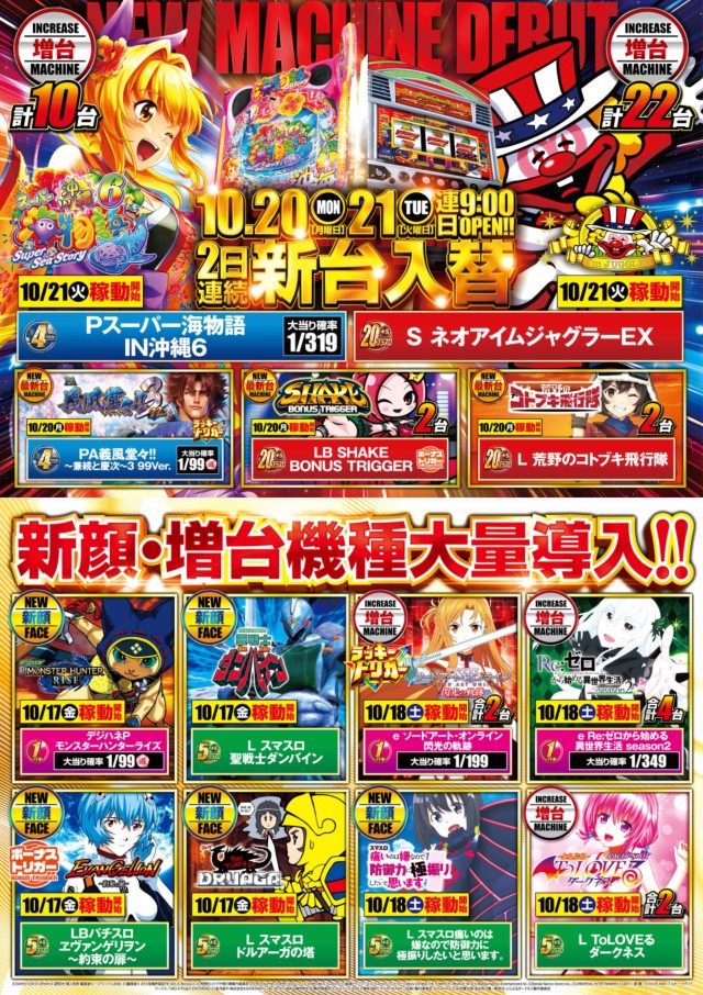 10月21日(火)2日連続新台入替!朝9時OPEN予定!