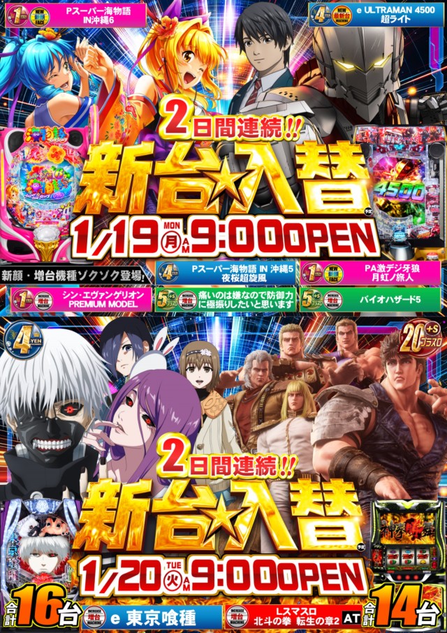 明日1月19日(月) ☆新台入替☆朝9時オープン♪
