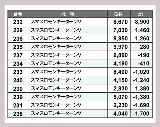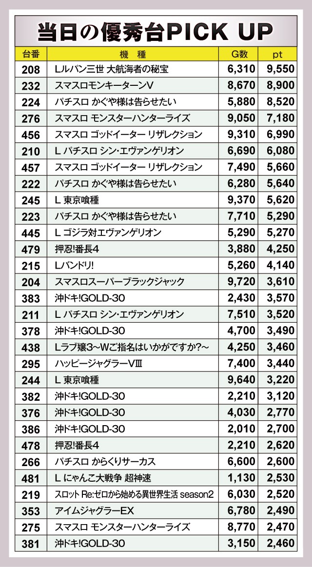 この日は特に『Lルパン三世 大航海者の秘宝』の破壊力が凄まじく、208番台+9,550枚と誰もが羨む記録を残している。さらに232番台『スマスロモンキーターンV』+8,900pt、224番台『パチスロ かぐや様は告らせたい』+8,520ptなど、人気機種が好記録をマークした。