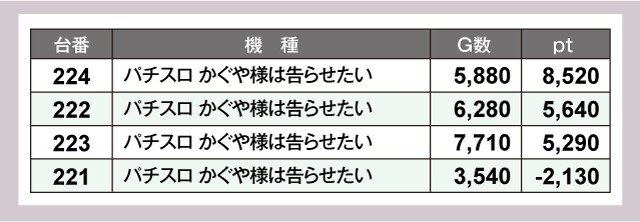 ひときわ目を引いたのが『パチスロ かぐや様は告らせたい』。4台中3台が+5,000ptオーバーと、ポテンシャルが大爆発していた。