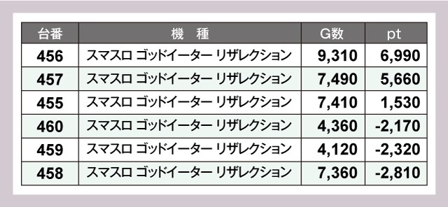 『スマスロ ゴッドイーター リザレクション』や『スマスロモンキーターンV』といった定番機種の盛り上がりも大きく、+6,000ptオーバー・+8,000ptオーバーの好調台が誕生していた。
