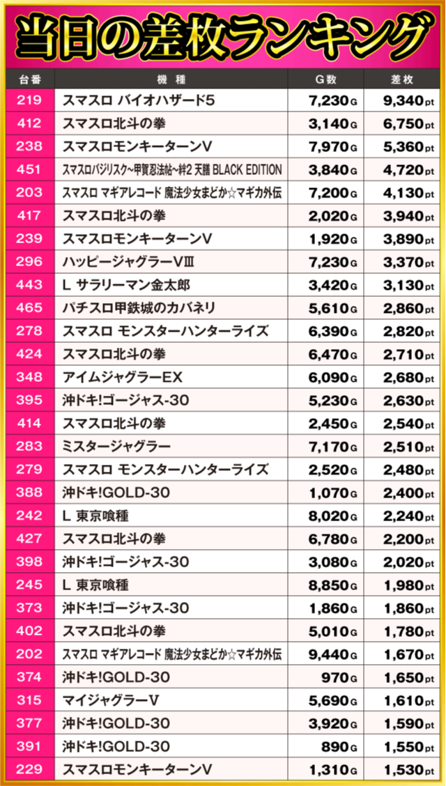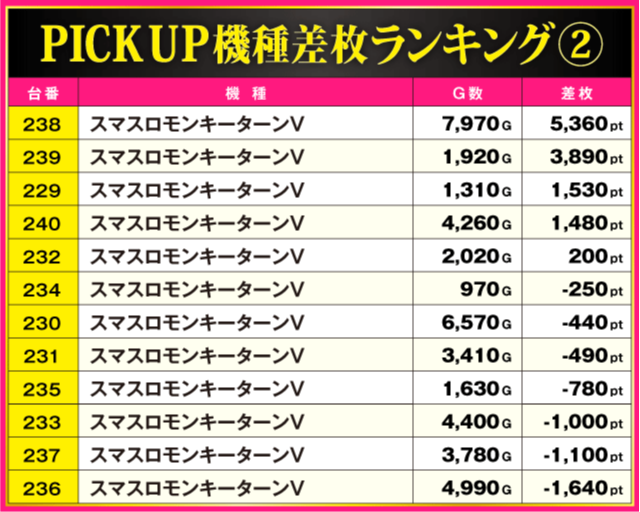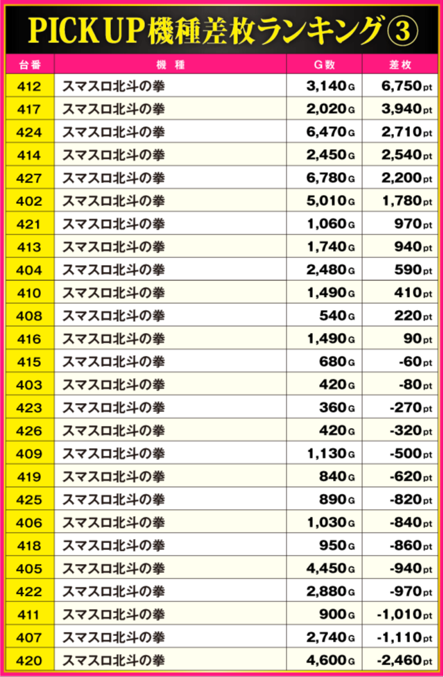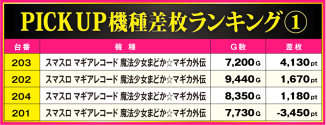続いてPICK UP機種をチェック!! 導入直後の新台『スマスロ マギアレコード 魔法少女まどか☆マギカ外伝』からは+4,130ptが発生。また、『スマスロモンキーターンV』と『スマスロ北斗の拳』は、差枚上位にランクインした台以外からも好調台が確認されており、半数ちかくの台がプラス差枚となっている。