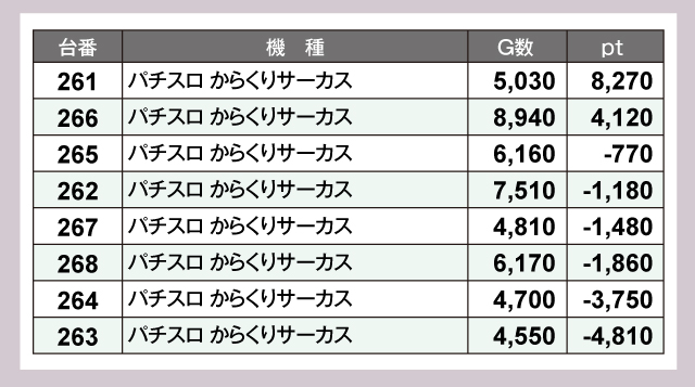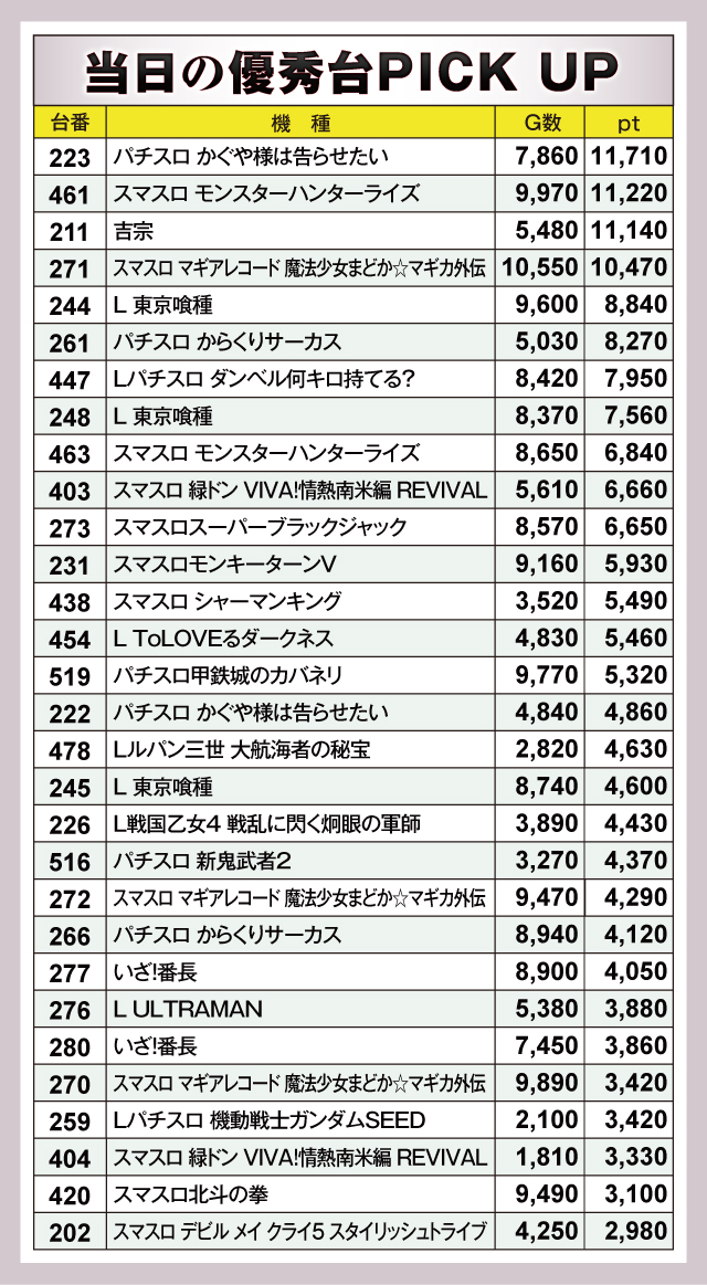 1万ptオーバーの優秀台が4台出現! 『パチスロ かぐや様は告らせたい』223番台が+11,710pt、『スマスロ モンスターハンターライズ』461番台が+11,220pt、『吉宗』211番台が+11,140ptと圧倒的好成績が並んでいる。そして『スマスロ マギアレコード 魔法少女まどか☆マギカ外伝』271番台も+10,470ptと続き、実力を示していた。