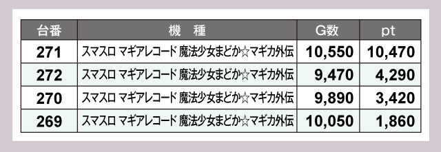 『スマスロ マギアレコード 魔法少女まどか☆マギカ外伝』は1万ptオーバーを達成した271番台を含む、2台が1万G以上も回されていてプレイヤーを満足させていたようだ。