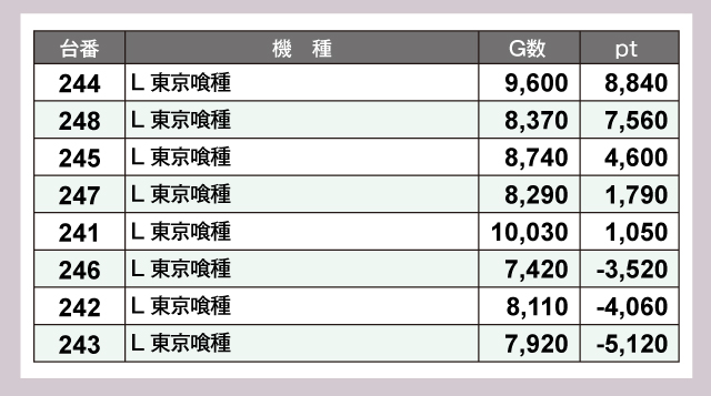 『パチスロ からくりサーカス』と『L 東京喰種』も終日の高稼働で、どちらも8,000pt超えの優秀台が飛び出している。