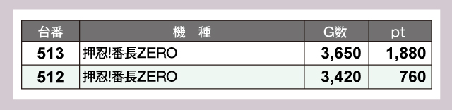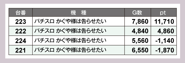 『押忍!番長ZERO』は設置2台ともがプラスpt。『パチスロ かぐや様は告らせたい』は4台中2台がプラスで、223番台の活躍によりトータルでも大きくプラスになっていた。
