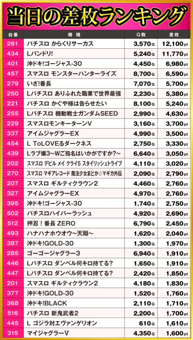 この日は、『パチスロ からくりサーカス』が+12,100ptを叩き出しランキングトップに。さらに、2位にランクインした『Lバンドリ!』も万枚超を達成している。また、その他の機種では『沖ドキ!ゴージャス-30』と『スマスロ モンスターハンターライズ』から+6,000pt超が飛び出すなど、人気機種を中心に多数の好調台を確認できた。