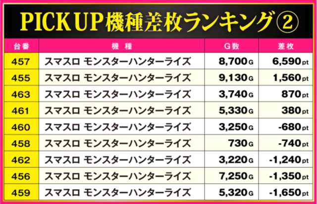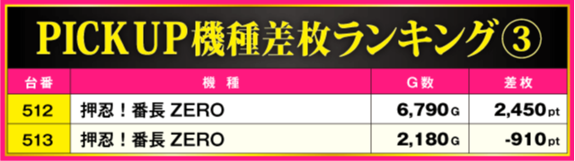 今回のPICK UP機種は全3機種。差枚ランキングの上位機種以外で目立っていたのが2つの番長シリーズで、『いざ!番長』が+5,700pt、『押忍!番長ZERO』が+2,450ptを記録。また、3機種トータルの全15台のうち約半数がプラス差枚で実戦を終えているだけに、ファンにとっては充実の一日となったのではないだろうか。