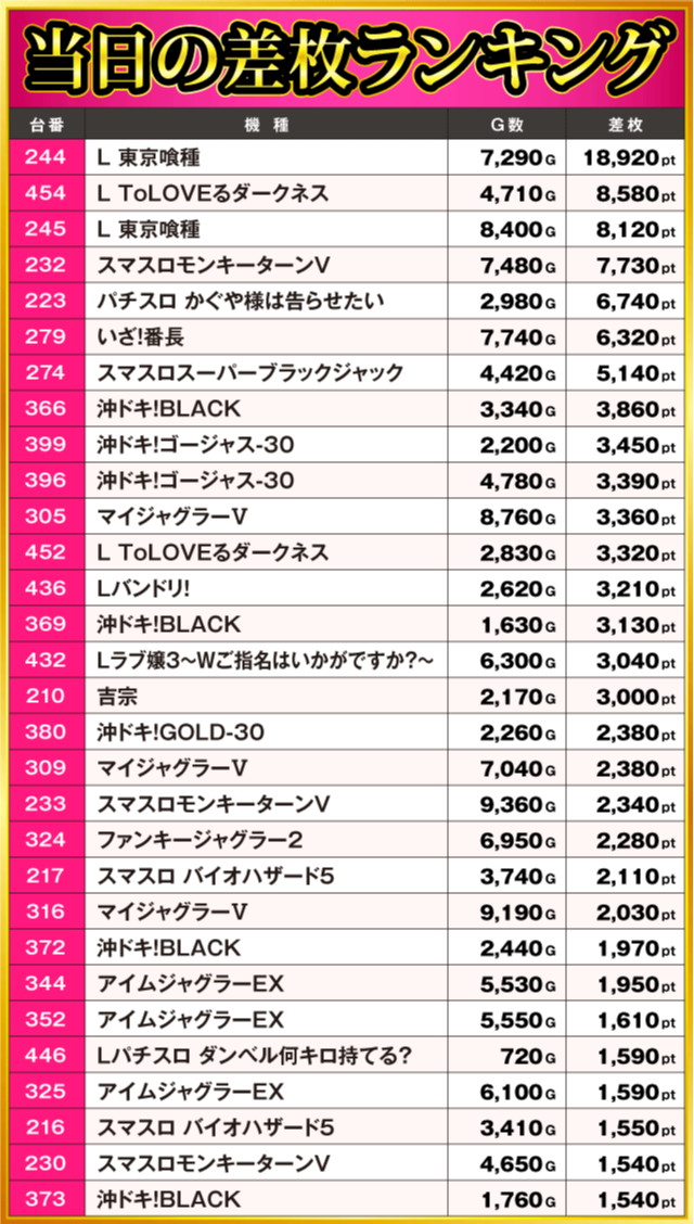 この日は、『L 東京喰種』の244番台が怒涛の+18,920ptを叩き出し堂々のランキングトップに。さらに、245番台からも+8,120ptが発生、差枚TOP3に2台がランクインする盛況ぶりを披露している。また、その他にも『L ToLOVEるダークネス』が+8,580ptを記録するなど、人気のスマスロを中心にハイスコアが続出し店内を盛り上げていた。