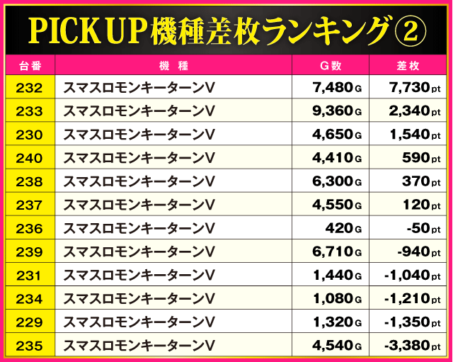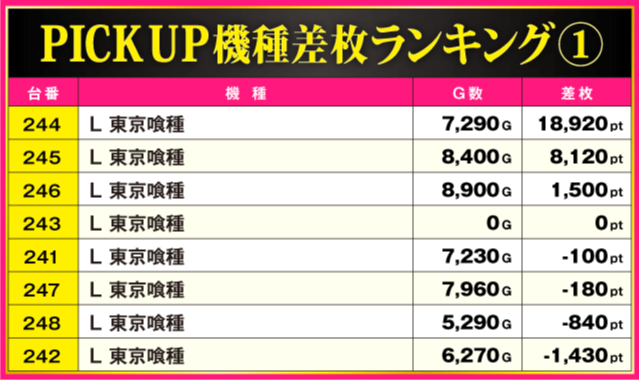 次にPICK UP機種の状況をチェック!! 『スマスロモンキーターンV』からは+7,730pt、『パチスロ かぐや様は告らせたい』からは+6,740ptを確認。また、ランキングを制した『L 東京喰種』は、最終的に8台の平均差枚が+3,250ptとなる見事な結果を残しているだけに、ファンにとって充実の一日となったのは間違いないだろう。
