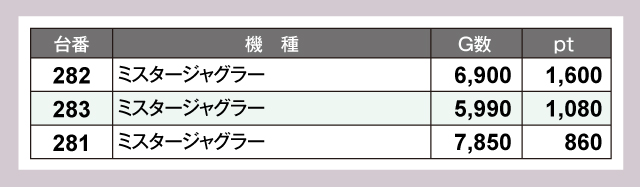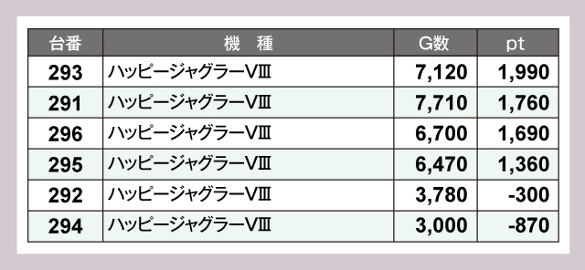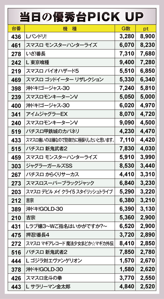 『Lバンドリ!』436番台が+8,900pt、『スマスロ モンスターハンターライズ』461番台が+8,230ptと誰もがうらやむ結果を残した。つづいて『いざ!番長』278番台が+7,680pt、『L 東京喰種』242番台が+7,280pt、『スマスロ バイオハザード5』219番台が+6,850ptと並ぶ。ほかにも優秀台が続々誕生し、見事なデータを形成していた。