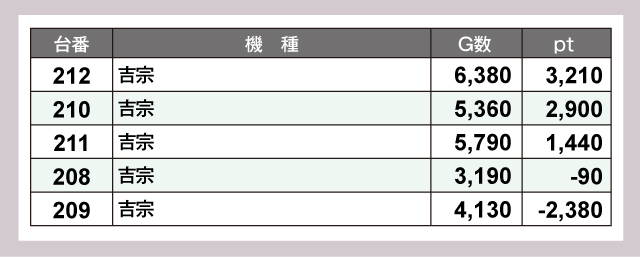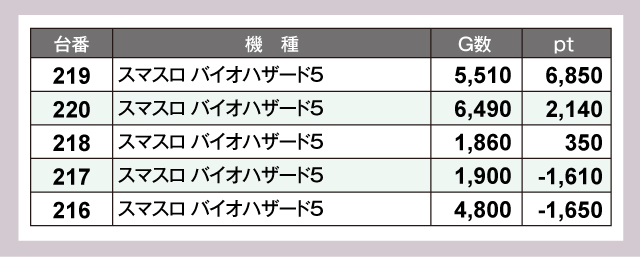 『吉宗』と『スマスロ バイオハザード5』はいずれも5台中3台がプラスptで、トータルptでも大きくプラスとなっている。