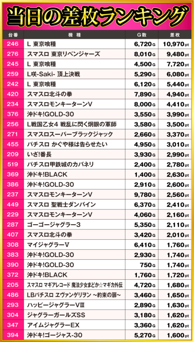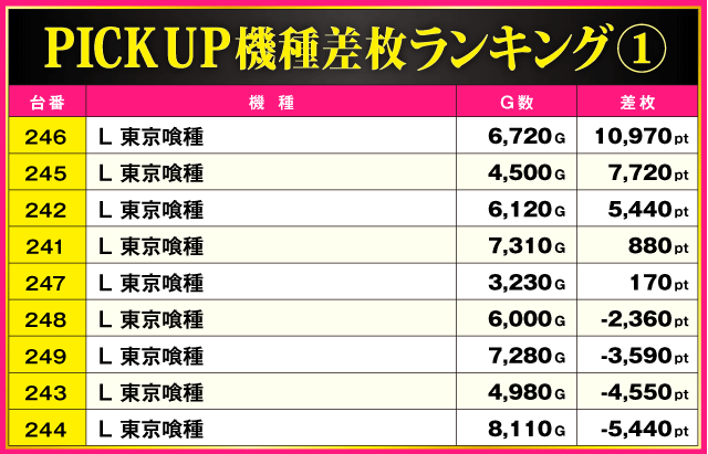 この日、最もプレイヤーの注目を集めたのが『L 東京喰種』で、246番台が万枚超の+10,970ptを叩き出しランキングトップに。さらに、+7,720ptに+5,440ptといった好成績が連発、差枚TOP5に3台がランクインする盛況ぶりを披露しファンを喜ばせていた。
