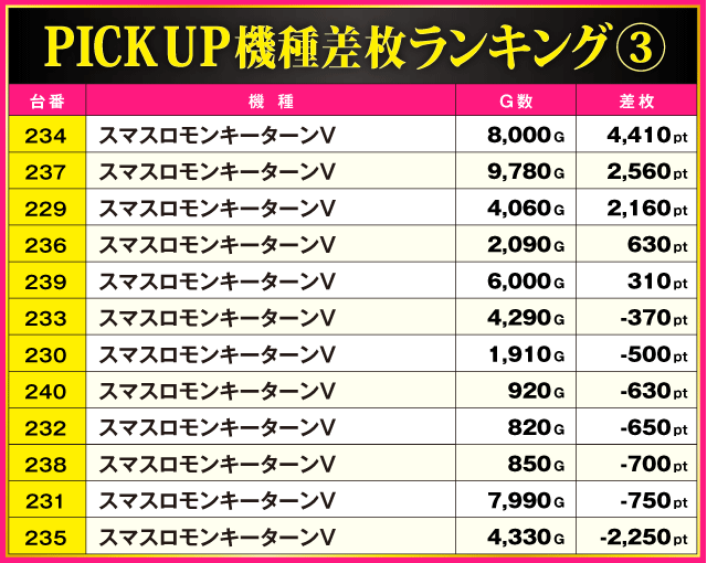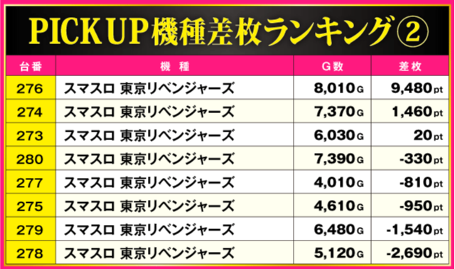 次にPICK UP機種の状況をチェック!! ランキングを制した『L 東京喰種』は、最終的に全9台中5台がプラス差枚となる見事な結果を残している。また、『スマスロ 東京リベンジャーズ』からは+9,480pt、『スマスロモンキーターンV』からは+4,410ptが飛び出しており、それぞれのシマは常に活気に満ち溢れる一日となった。