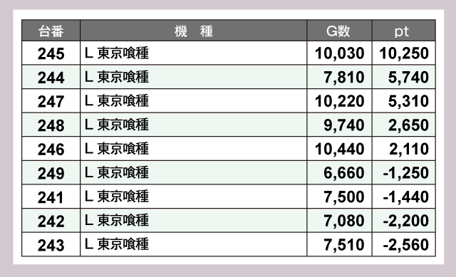 『L 東京喰種』は9台中5台がプラスpt。うち3台が1万G超えを達成していて、同機種の支持率の高さがうかがえた。