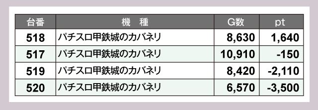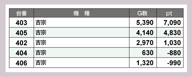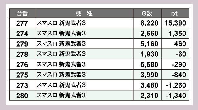 21台と大量設置の『スマスロ北斗の拳』からは4桁プラスの台を6台確認している。5台設置の『吉宗』からは3台。8台設置の『スマスロ 新鬼武者3』は2台で、うち1台が1万ptオーバーを達成していた。