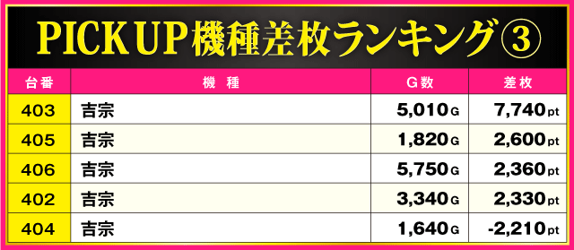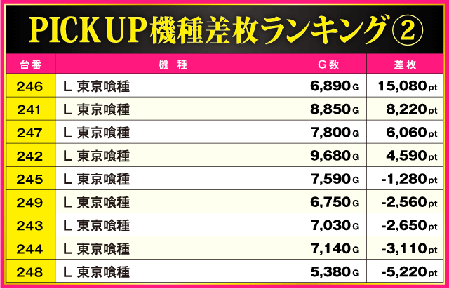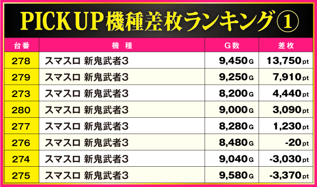 続いてPICK UP機種の状況をチェック!! 差枚上位にランクインした『スマスロ 新鬼武者3』からは、+13,750pt以外にも+7,910ptが発生。また、『L 東京喰種』は+15,080ptのほか、+6,000pt超が2台、『吉宗』は全5台中4台が4桁プラス差枚となっているだけに、3機種のシマは常に活気に満ち溢れる一日となった。