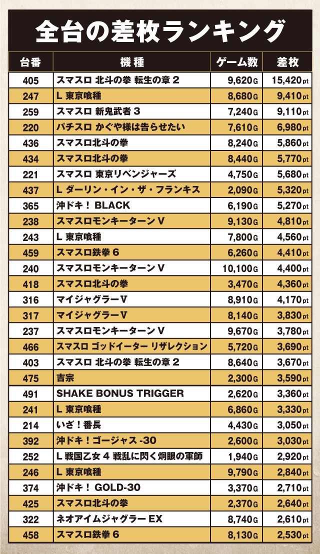 『スマスロ 北斗の拳 転生の章2』405番台が、+15,420ptという圧倒的な成績で首位に輝いた。そして『L 東京喰種』247番台が+9,410pt、『スマスロ 新鬼武者3』259番台が+9,110ptでつづく。さらに『パチスロ かぐや様は告らせたい』220番台の+6,980pt、『スマスロ北斗の拳』436番台の+5,860pt、434番台の+5,770ptと優秀台が並んでいた。以下にも『スマスロ 東京リベンジャーズ』221番台の+5,680ptなど、見事なデータが詰まった迫力満点のランキングとなっている。