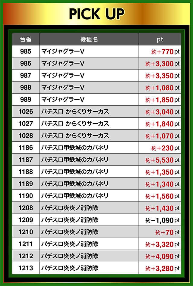 『マイジャグラーⅤ』はとくに優秀台が並ぶ場所が多く、985番台から989番台までが連なってプラス。986番台と987番台は約+3,300pt以上となった。