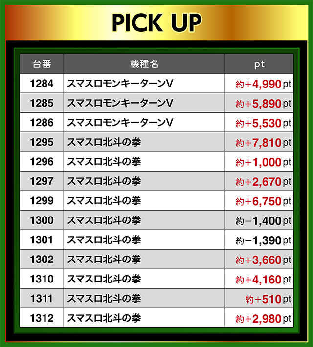 『スマスロモンキーターンV』は、1284番台から1286番台までの3台が連続して約+4,900ptオーバー。