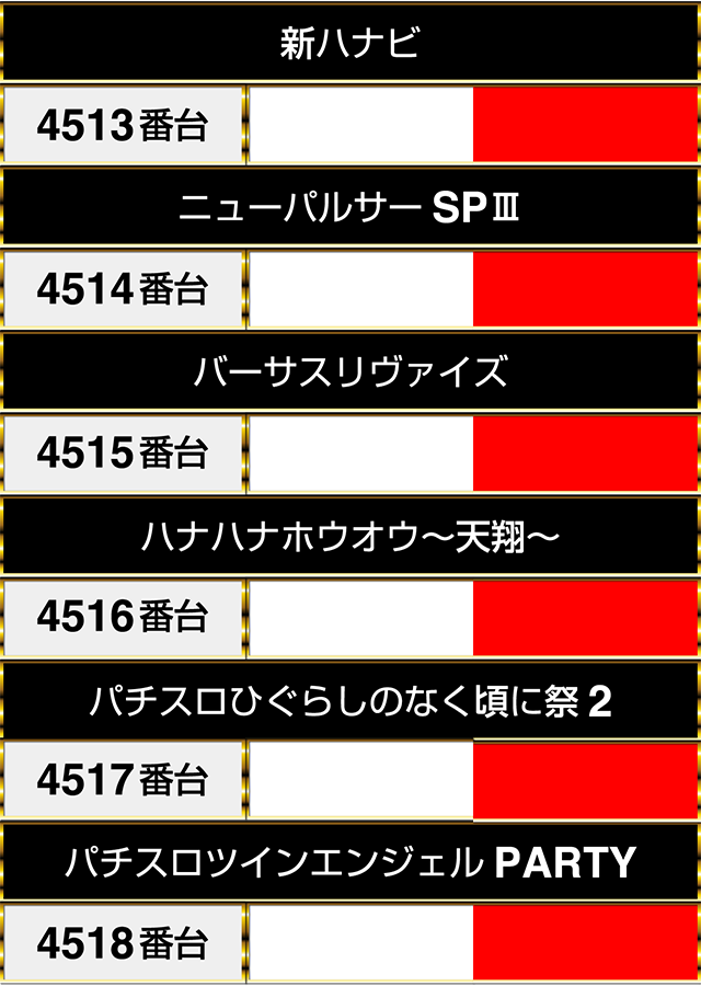 『新ハナビ』の4513番台から『パチスロツインエンジェルPARTY』の4518番台までが並んでプラスpt!!