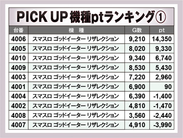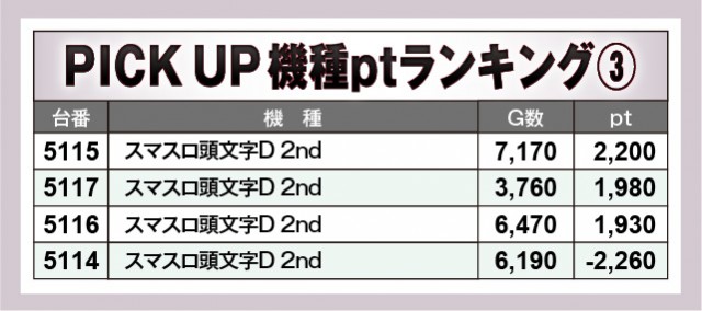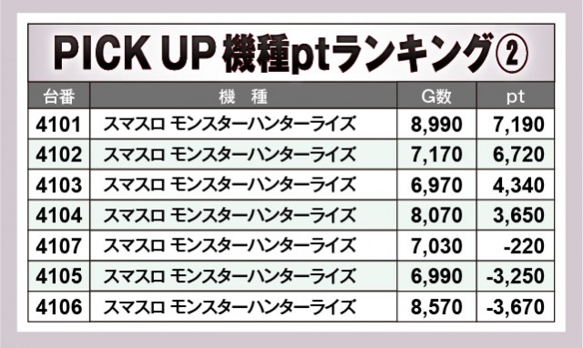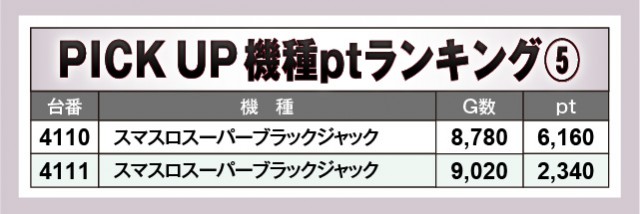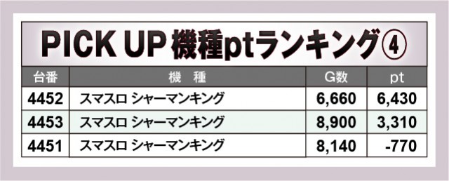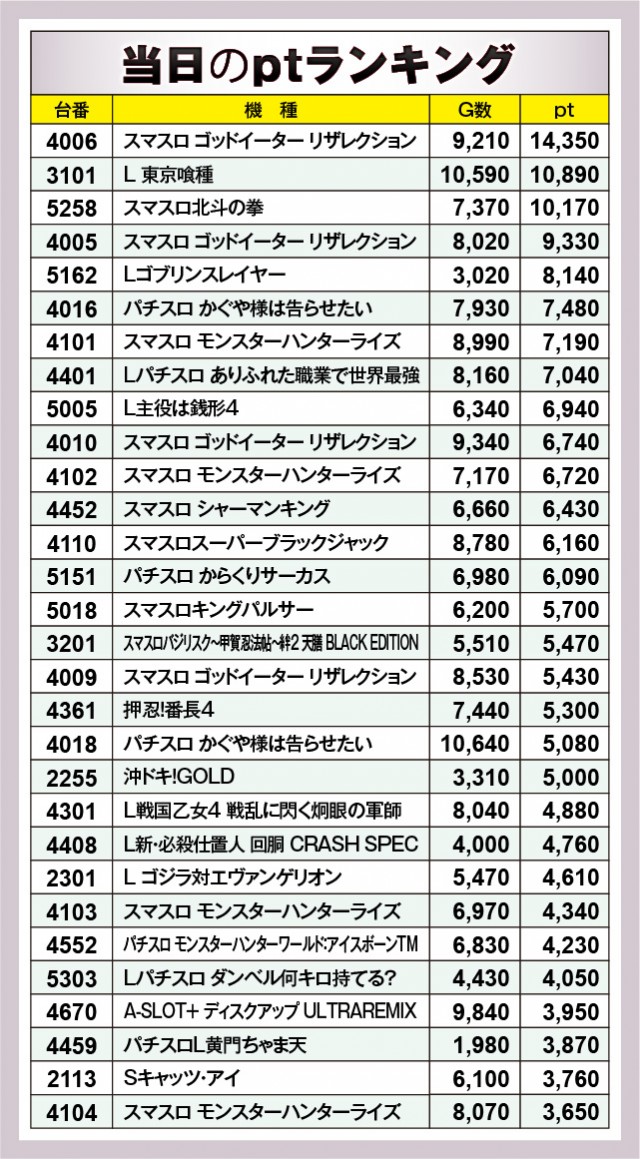 『スマスロ ゴッドイーター リザレクション』から万pt OVERが飛び出し、『スマスロ モンスターハンターライズ』も終日を通して打ち込まれ、両人気機種の存在感はひと際大きかったと言える。『スマスロ頭文字D 2nd』もじっくりと打ち込まれており、ファンは好感触を手にしていたに違いない。そして新台『スマスロ シャーマンキング』『スマスロスーパーブラックジャック』も同様にハイパフォーマンスを披露し、特に後者は全台プラスptと、大きくアピールすることに成功した。