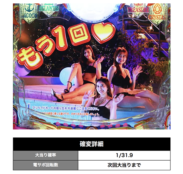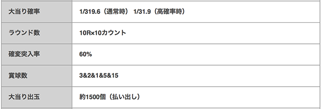 大当りはすべて10Rで、出玉は1500個(払い出し)。通常大当り後には時短が100回転付くおなじみの仕様だ。