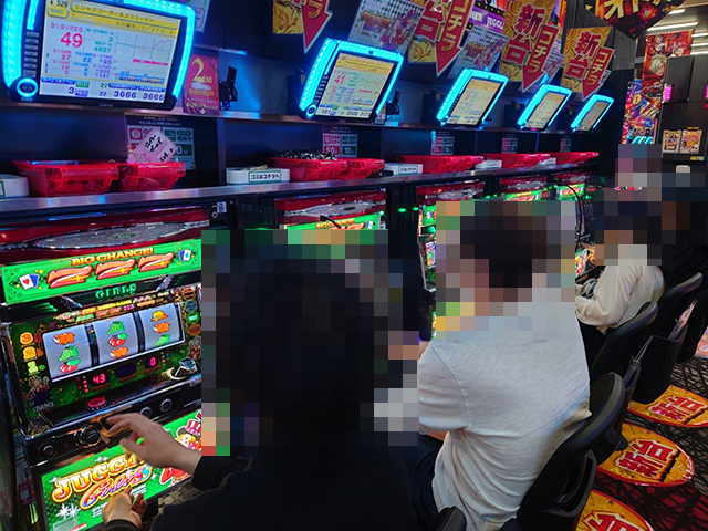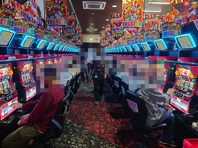 「マイジャグラーⅤ」も人気があり、楽しげなプレイヤーがズラリと並んでいた。