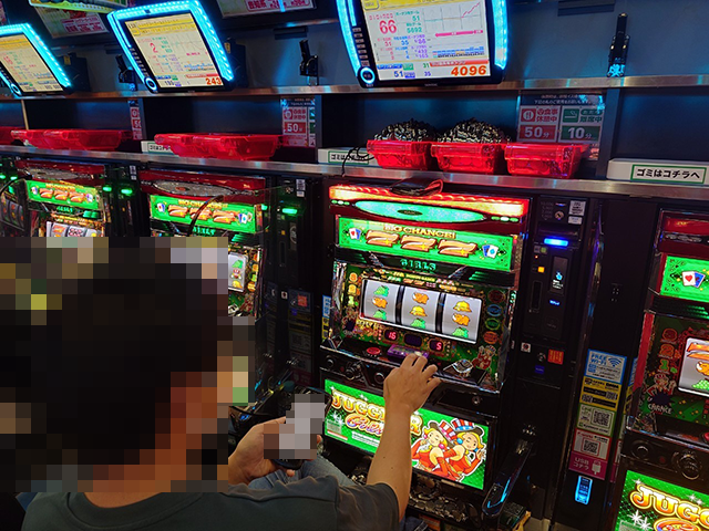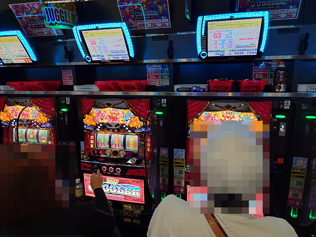 17時半を過ぎた頃のパチスロでは、ジャグラーシリーズのにぎわいが大きく、「ジャグラーガールズSS」や「マイジャグラーⅤ」に60回以上のボーナスを獲得している台があった。