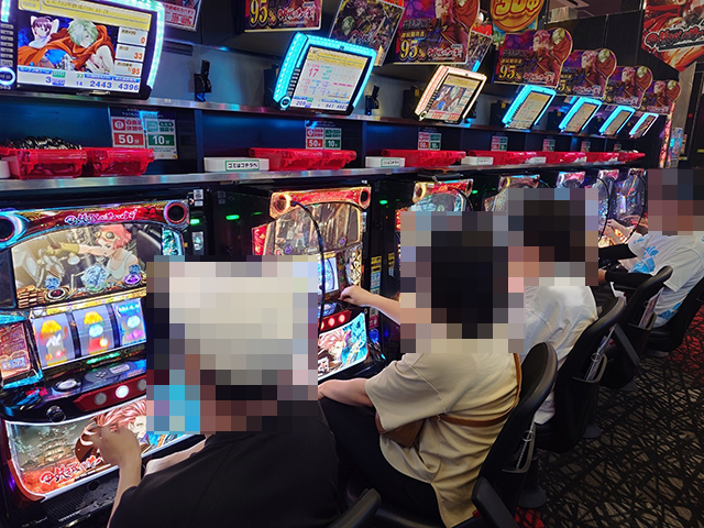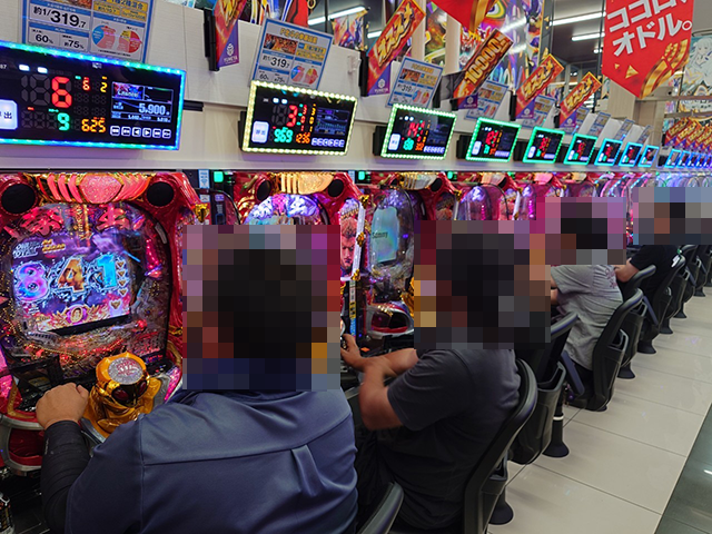 うれしそうに遊技をおこなうプレイヤーが並ぶなかで、2箱以上や1箱以上の持ち玉を確認した。