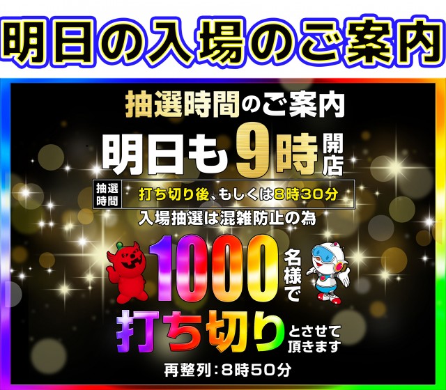 8時30分より抽選開始予定(打切り1000名様。1000名様に到達した場合は予定時刻より早く抽選を行う場合がございます) |
