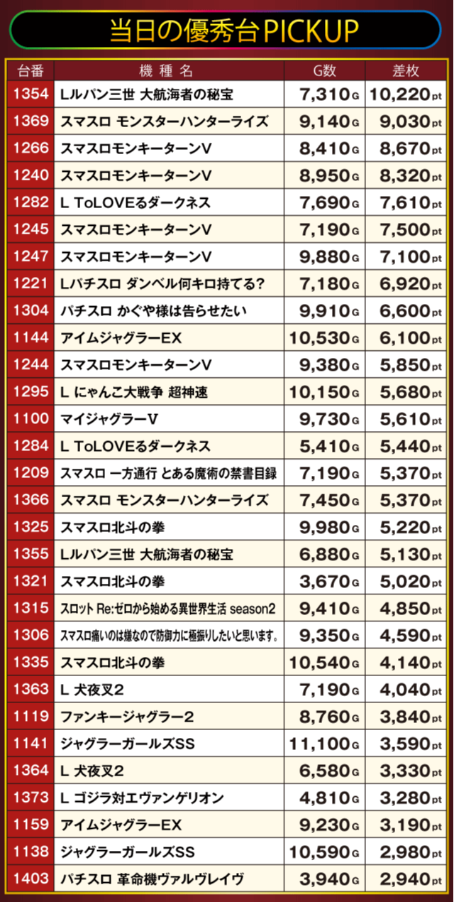 この日は、人気のスマスロを中心に好調台を多数確認。そんな中、『Lルパン三世 大航海者の秘宝』が+10,000pt超を叩き出しランキングトップに輝いた。続く『スマスロ モンスターハンターライズ』も万枚目前の+9,000pt超を記録する盛況ぶりを見せている。
