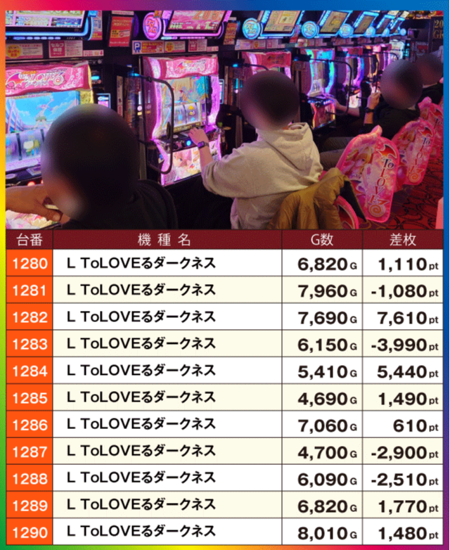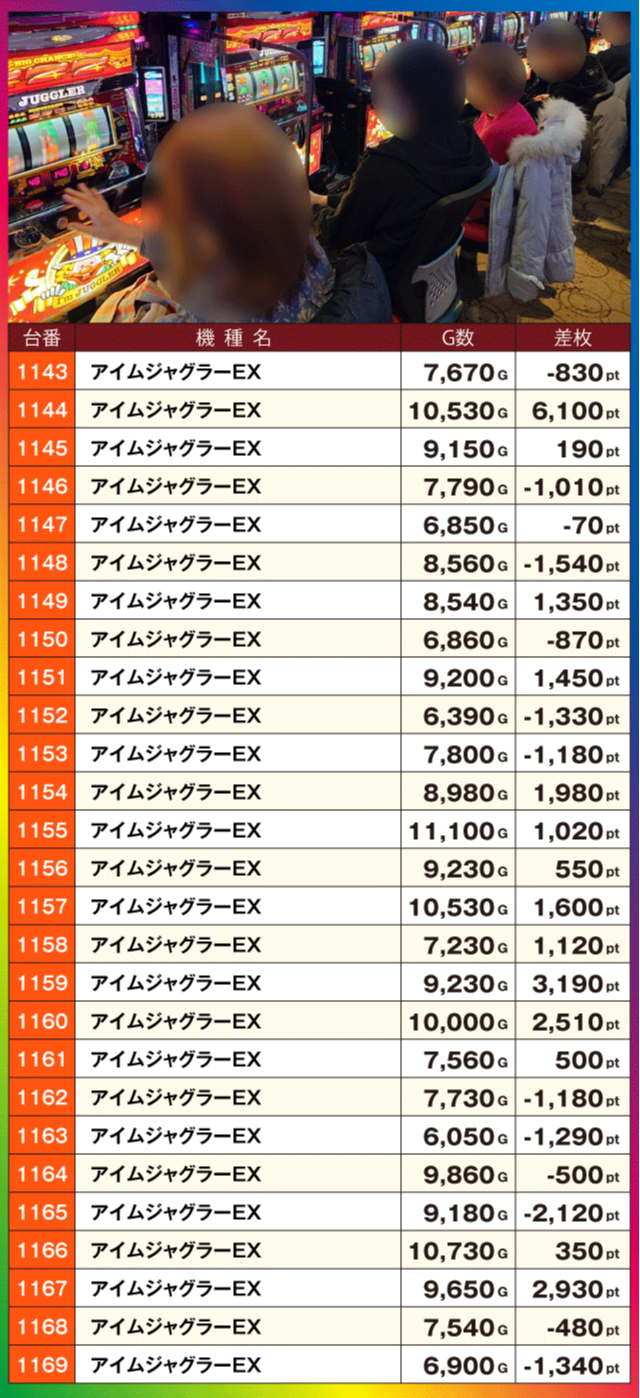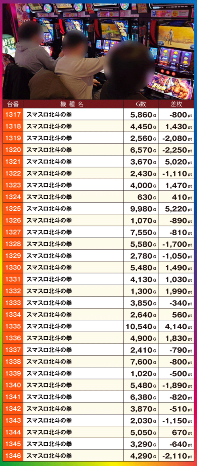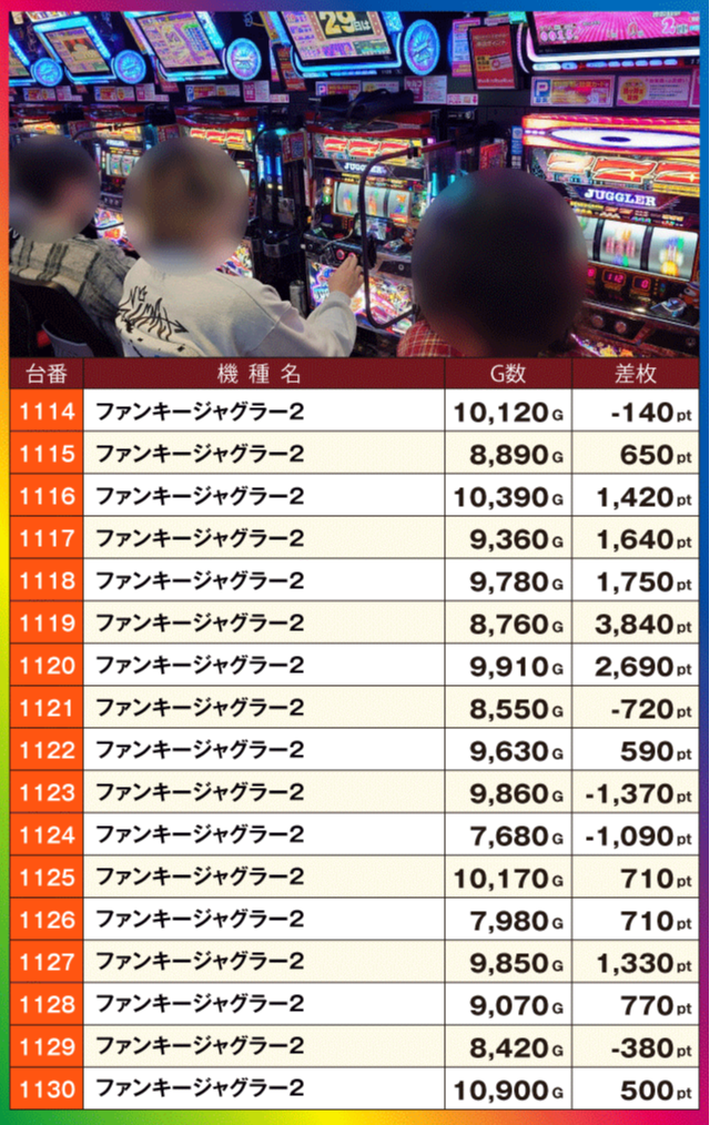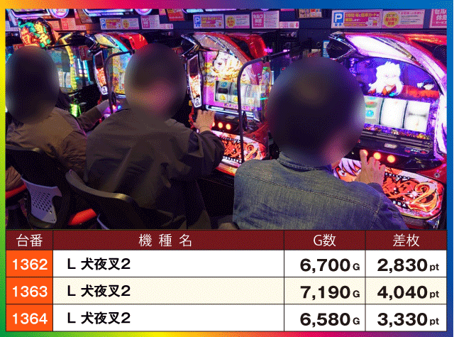 次に、注目機種の状況をチェックすると、『ファンキージャグラー2』は全17台中12台、『L 犬夜叉2』は全台がプラス差枚で終了している。さらに『アイムジャグラーEX』で+6,000pt超、『スマスロ北斗の拳』から+5,000pt超が2台、『L ToLOVEるダークネス』で+7,000pt超と、全てのシマにチャンスが潜んでいたのは間違いないだろう。