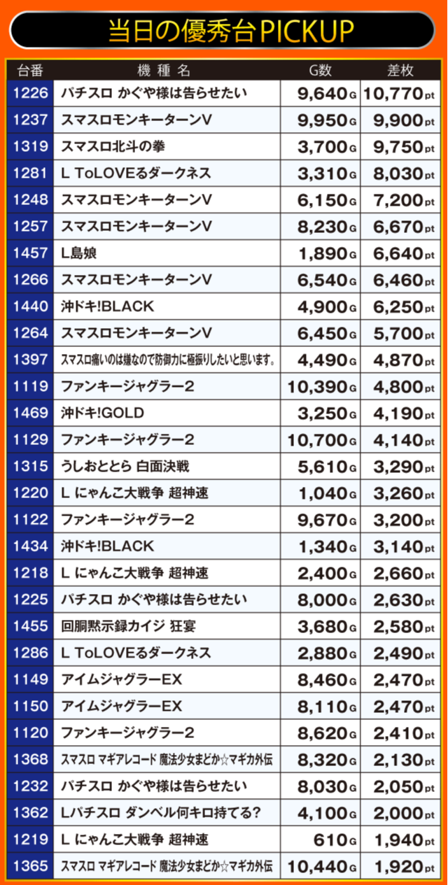 この日、最もプレイヤーの注目を集めたのが『パチスロ かぐや様は告らせたい』で1226番台万枚超を達成。次いで『スマスロモンキーターンV』と『スマスロ北斗の拳』が+9,000pt超と、ランキングベスト3が実にハイレベルな結果を残している。その他にも、『L ToLOVEるダークネス』で+8,000pt超、『L島娘』で+6,000pt超など、人気のスマスロを中心に好成績が続出する一日となった。