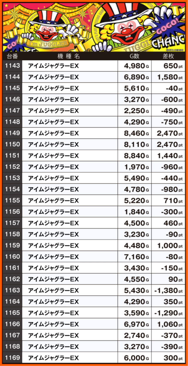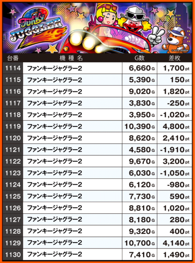 続いて注目機種をチェック!! 同店の看板機種であるジャグラーシリーズは、『ファンキージャグラー2』の+4,000pt超を筆頭に多数の好調台を確認。『アイムジャグラーEX』も含めた全44台のうち半数以上の台がプラス差枚となっている。また、『スマスロモンキーターンV』はランキング上位台以外にも+7,000pt超+6,000pt超が2台と、ハイスコアが連発しファンを喜ばせていた。