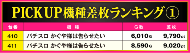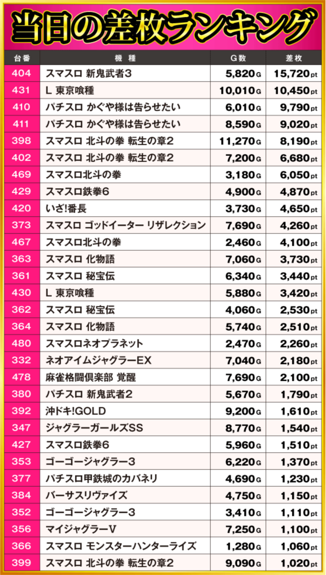この日、最もプレイヤーの注目を集めたのが『スマスロ 新鬼武者3』で、404番台が圧巻の+15,720ptを叩き出しランキングトップに。続く『L 東京喰種』も万枚超、『パチスロ かぐや様は告らせたい』から+9,000pt超が2台も飛び出すなど、人気のスマスロを中心にハイスコアが続出している。