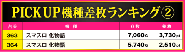 今回のPICK UP機種は全3機種で、好成績が発生した『パチスロ かぐや様は告らせたい』以外に『スマスロ 化物語』と『スマスロ 秘宝伝』から+3,000pt超を確認。しかも、3機種トータルの6台全てがプラス差枚で実戦を終えているだけに、それぞれのシマは終日ファンの笑顔と活気に満ち溢れていた。