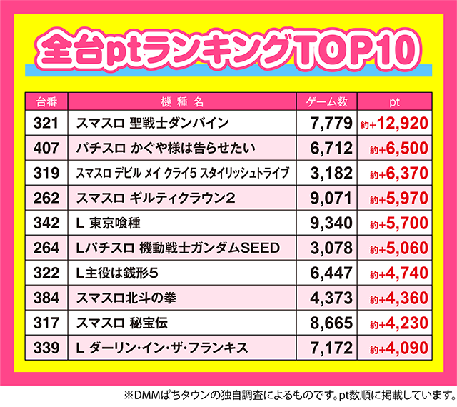 「パチスロ かぐや様は告らせたい」の407番台と「スマスロ デビル メイ クライ5 スタイリッシュトライブ」の319番台も約+6,300pt以上となった。