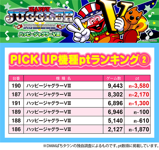 「ハッピージャグラーVⅢ」では、190番台が約+3,580pt。