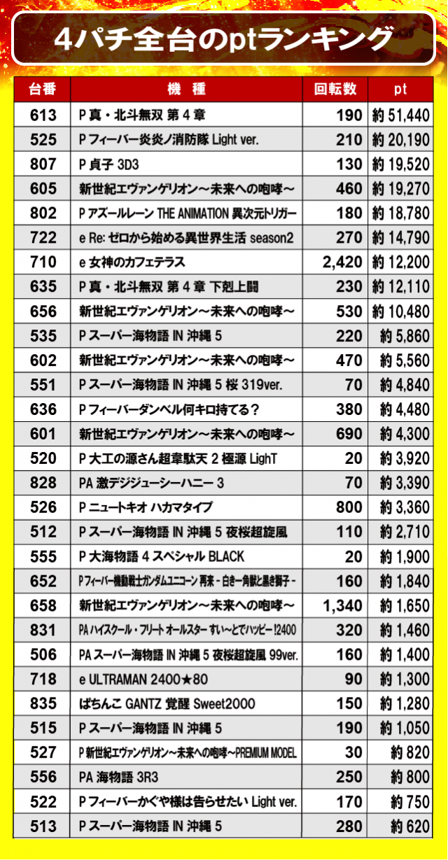 パチンココーナーでは『P真・北斗無双 第4章』が約51,440ptを打ち立て、店内の盛り上がりを牽引する存在となっていた!これに続き『Pフィーバー炎炎ノ消防隊Light ver.』が約20,190ptをマーク!何よりも幅広い機種が名を連ねあらゆる機種にチャンスがあったと言えよう。