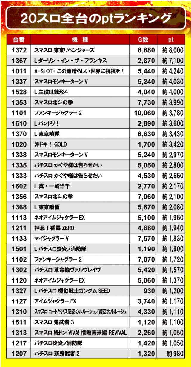 ①20スロ全台のptランキング