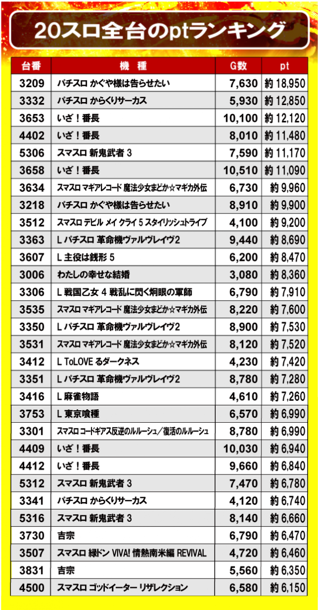 ①20スロ全台のptランキング