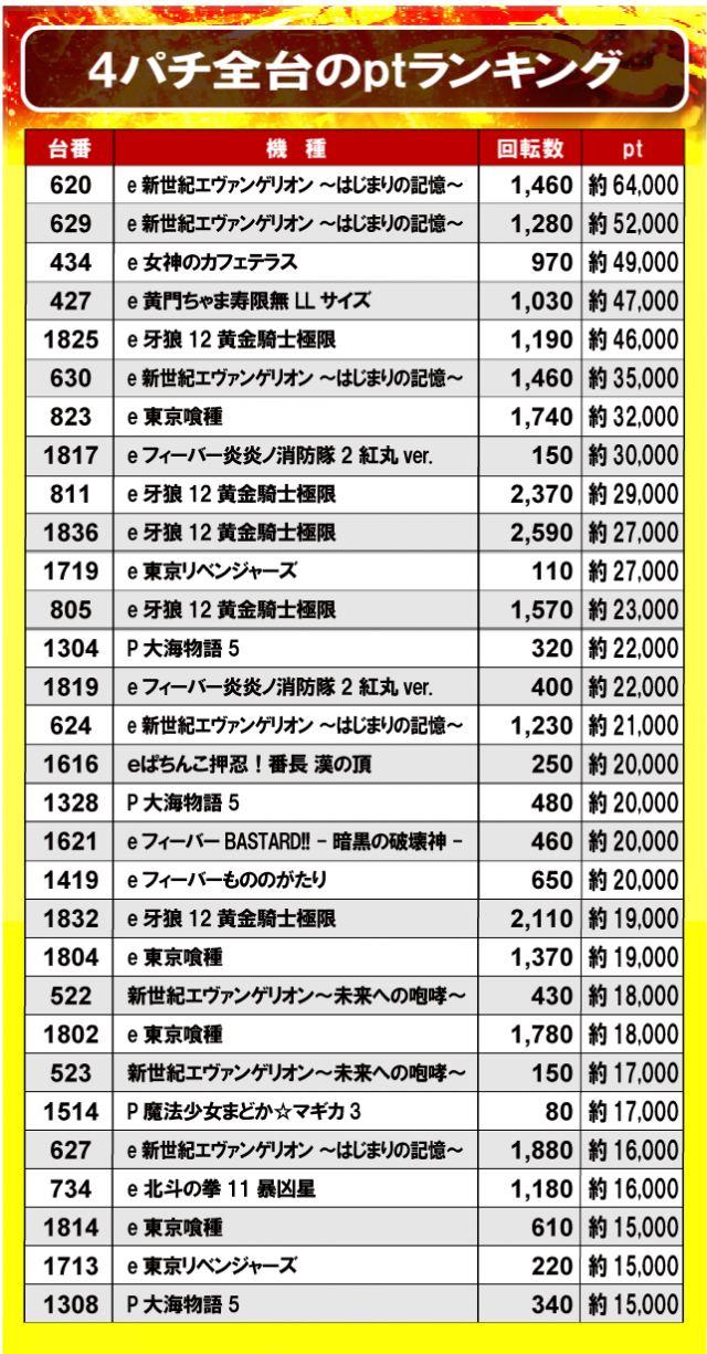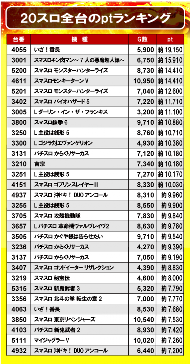 『いざ!番長』が驚異の約19,150ptを叩き出し、ptランキングTOPに!そして、万ptOVERはそれを含めて合計で14台を確認!さらにトップ30のラインは約7,000ptOVERで、終日勢いの止まらない様子が見られた!