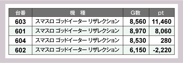 この日最も目立っていたのが603番台『スマスロ ゴッドイーター リザレクション』で、唯一の万枚オーバーを達成していた。