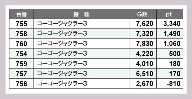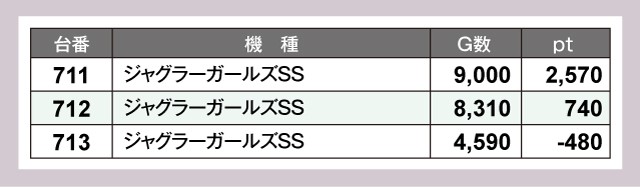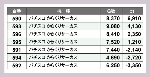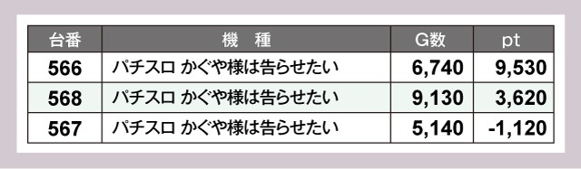 『パチスロ かぐや様は告らせたい』は3台中2台がプラス。566番台+9,530pt、568番台+3,620ptと絶好調だった。