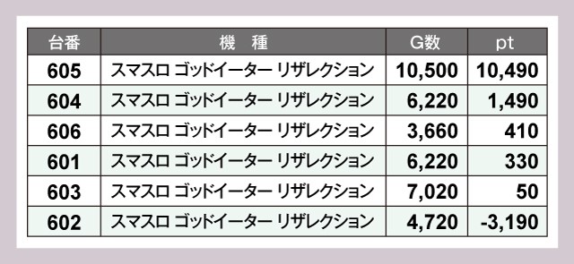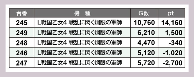 店内をチェックすると、245番台『L戦国乙女4 戦乱に閃く炯眼の軍師』と605番台『スマスロ ゴッドイーター リザレクション』が1万ptオーバーの素晴らしい結果を残している。