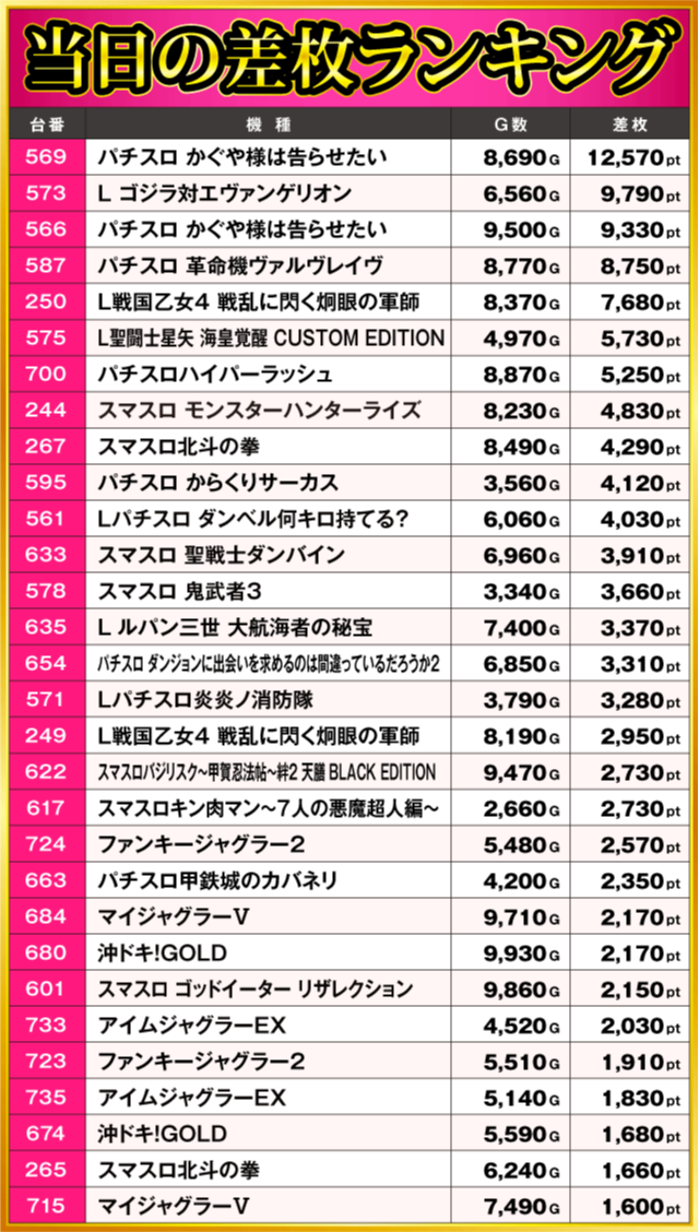 この日、最もプレイヤーの注目を集めたのが『パチスロ かぐや様は告らせたい』で、万枚超の+12,570ptを叩き出しランキングトップに。その他の機種では『L ゴジラ対エヴァンゲリオン』で+9,790pt、『パチスロ 革命機ヴァルヴレイヴ』で+8,750ptなど、人気のスマスロを中心に好成績を多数確認できた。